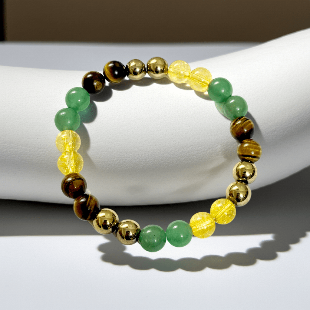 Money magnet bracelet, combining pyrite, citrine, tiger eye, and green aventurine, is believed to attract wealth, boost confidence, enhance decision-making, and bring luck in financial matters. It's a tool for manifesting abundance and financial success.