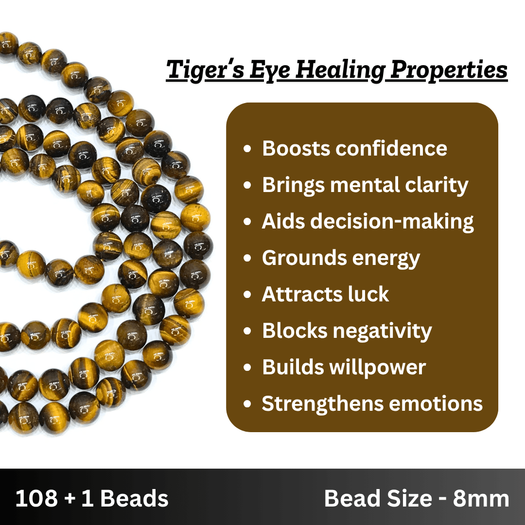 "Channel strength, protection, and focused energy with our stunning Tiger Eye Japa Mala – a perfect blend of purpose and elegance to elevate your spiritual journey and daily meditation."