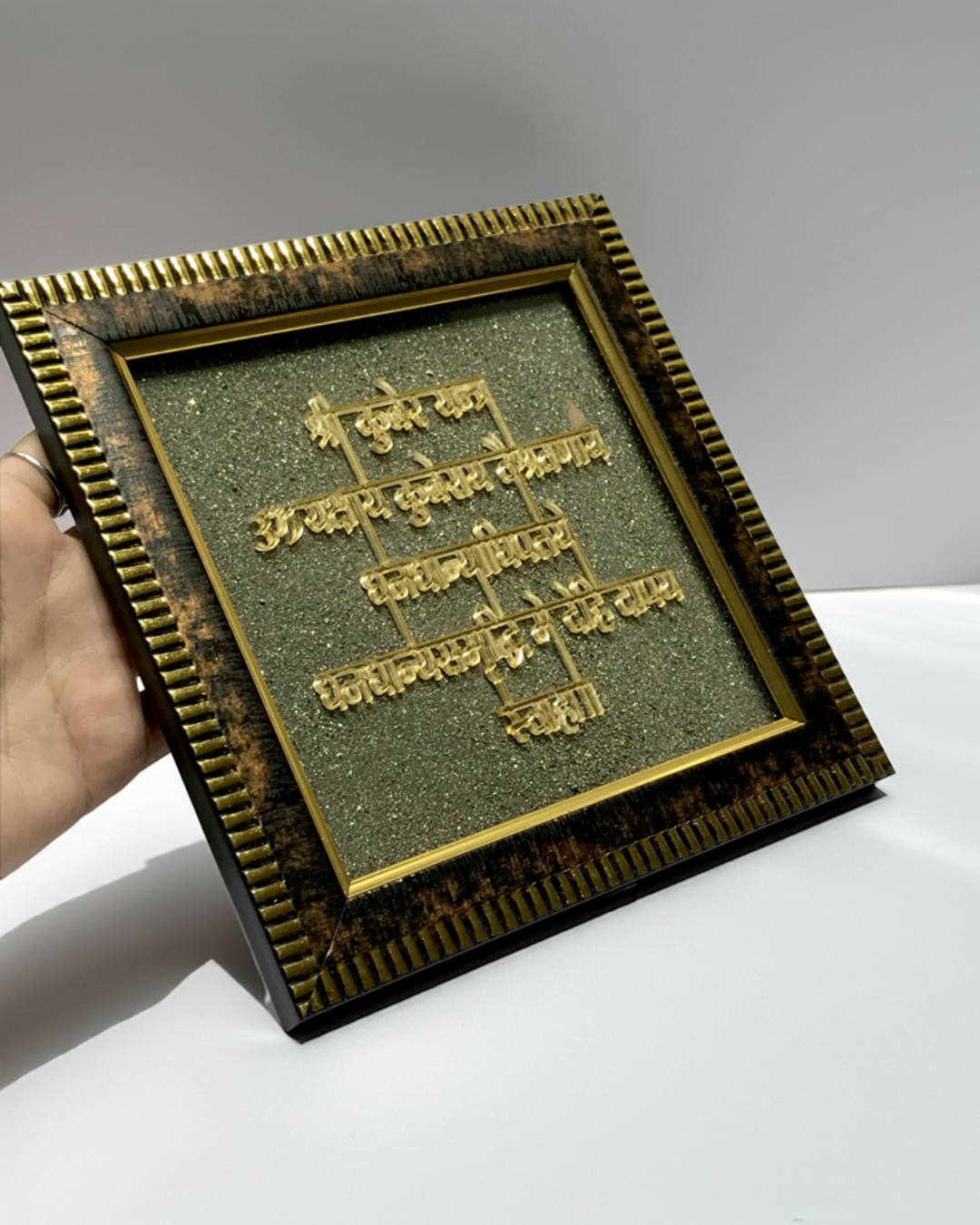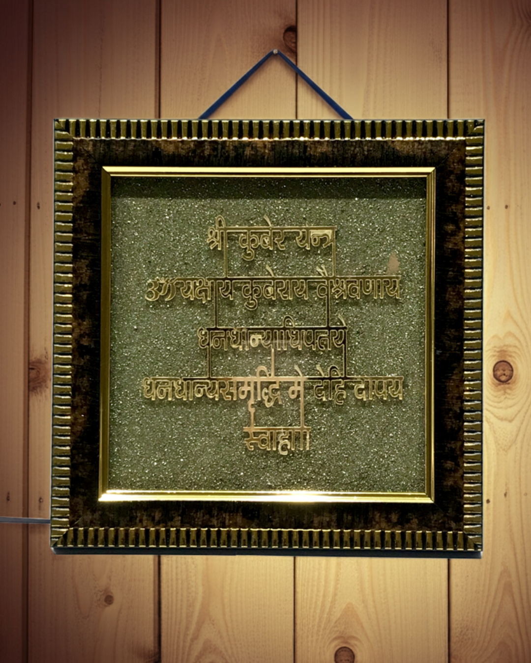 A Kuber Yantra on Pyrite Dust in a Frame is a highly auspicious and powerful combination of divine wealth energy and crystal abundance vibrations. It merges the blessings of Lord Kuber, the God of Wealth, with the protective and prosperity-attracting powers of Pyrite, making it a perfect item for homes, offices, shops, or spiritual spaces.