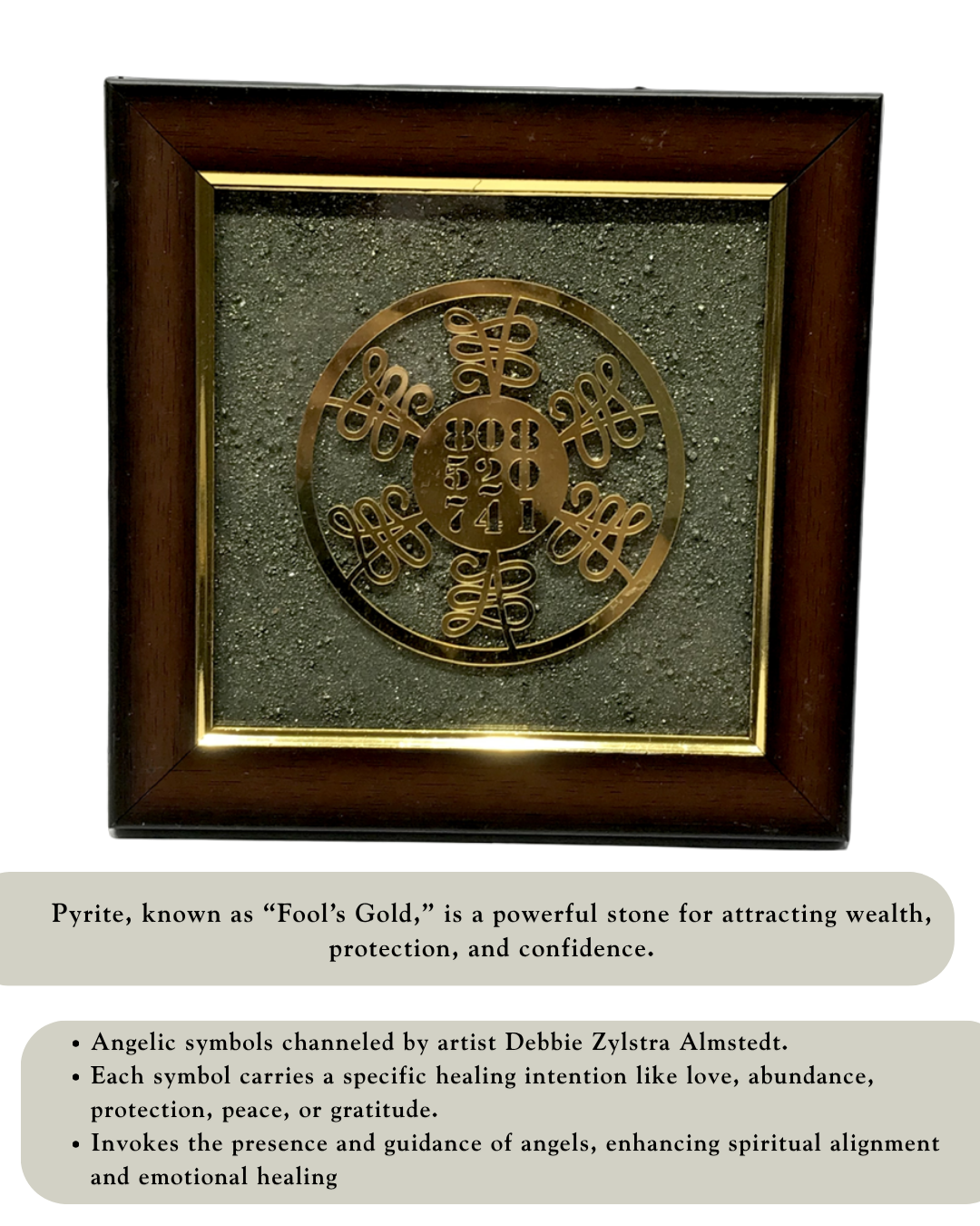 A Zibu Symbol on Pyrite Dust in a Frame is a unique and spiritually enriching decor item that combines the angelic language of Zibu symbols with the abundance-attracting and protective energy of Pyrite. This framed piece radiates positivity, healing, and high vibrations, making it ideal for homes, healing centers, meditation spaces, or work areas.
